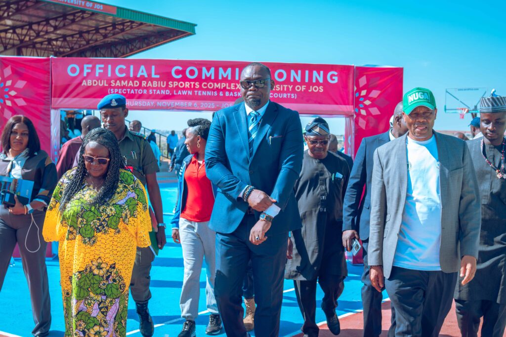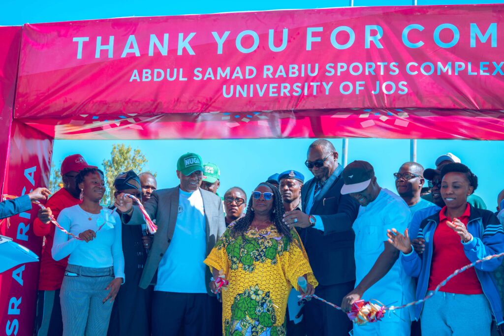 Image L-R: Pwajok Jane Kangyang, SUG President, University of Jos; Prof. Tanko Ishaya, Vice Chancellor, University of Jos; H. E. Mrs. Josephine Piyo, Deputy Governor, Plateau State; Dr. Ubon Udoh, MD/CEO, ASR Africa; Hon. Musa Ibrahim Ashoms, Commissioner for Youth & Sports Devt., Plateau State; and Prof. Rejoice Songden, Registrar/Secretary to Council, University of Jos during the commissioning of the Abdul Samad Rabiu Sports Complex.